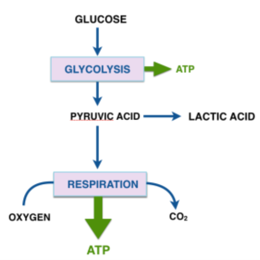 Two major processes, glycolysis and respiration, provide ATP. Glycolysis, common to almost all living cells, converts glucose into a three carbon compound pyruvic acid (or pyruvate; acids have two different forms and the names are used interchangeably in biochemistry). Glycolysis does not require oxygen and is referred to as anaerobic metabolism. Pyruvate is a key metabolite and can be converted to many substances. Some cells — rapidly exercising muscle, red blood cells, and some microorganisms—are restricted to anaerobic metabolism and the final product from pyruvate in these cases is lactate (lactic acid).