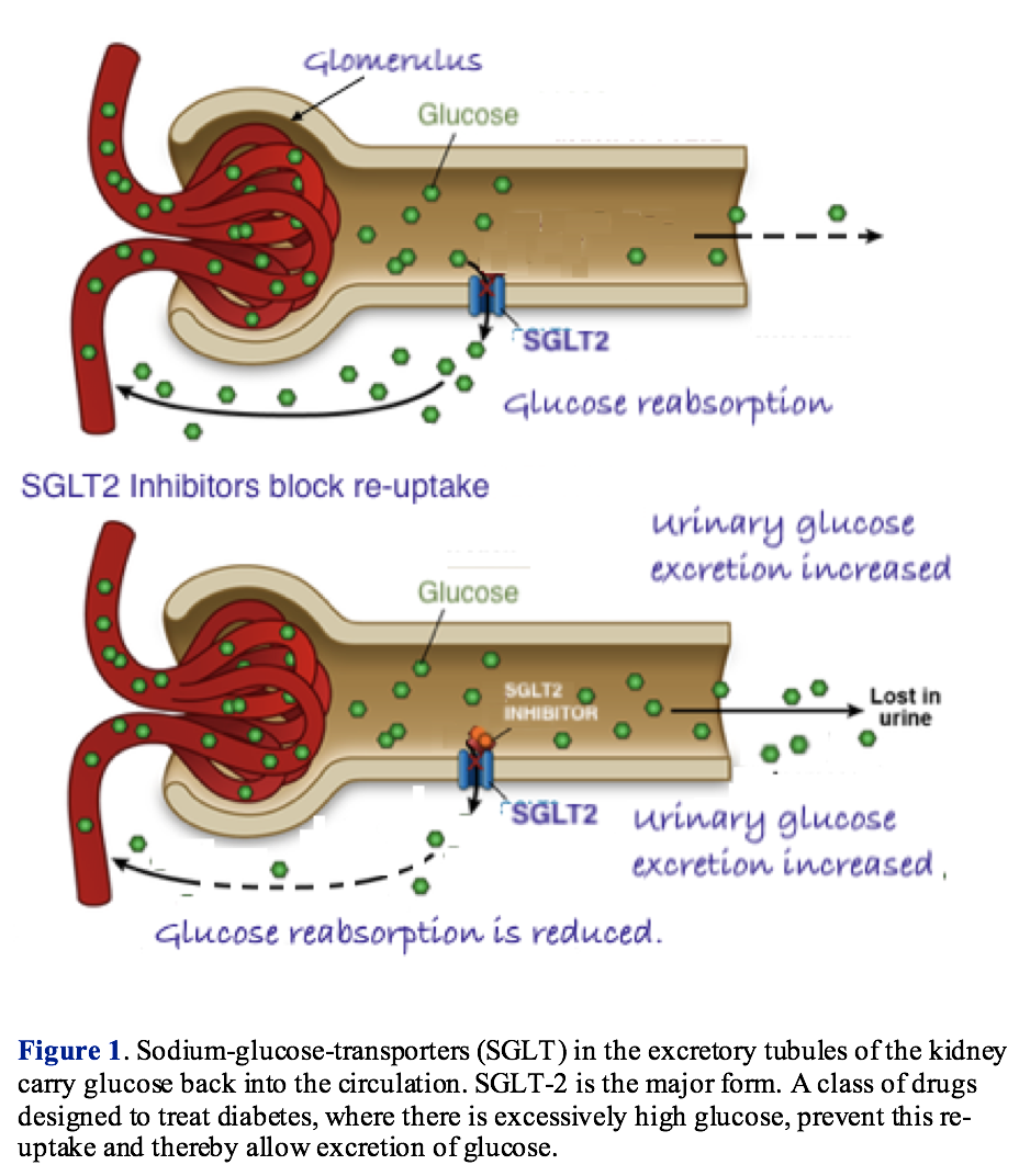 Humans have evolved multiple mechanisms to insure that blood glucose is maintained at a relatively constant level. Under normal conditions, to prevent excretion of glucose in the urine, the kidney contains proteins that transport the sugar back into the circulation from the tubules (Figure 1). The sodium-glucose transport proteins (SGLTs) and, in particular, the SGLT-2 forms, provide the mechanism for the re-uptake of glucose that has been filtered. In diabetes, the system may not be able to keep up with the high blood glucose.